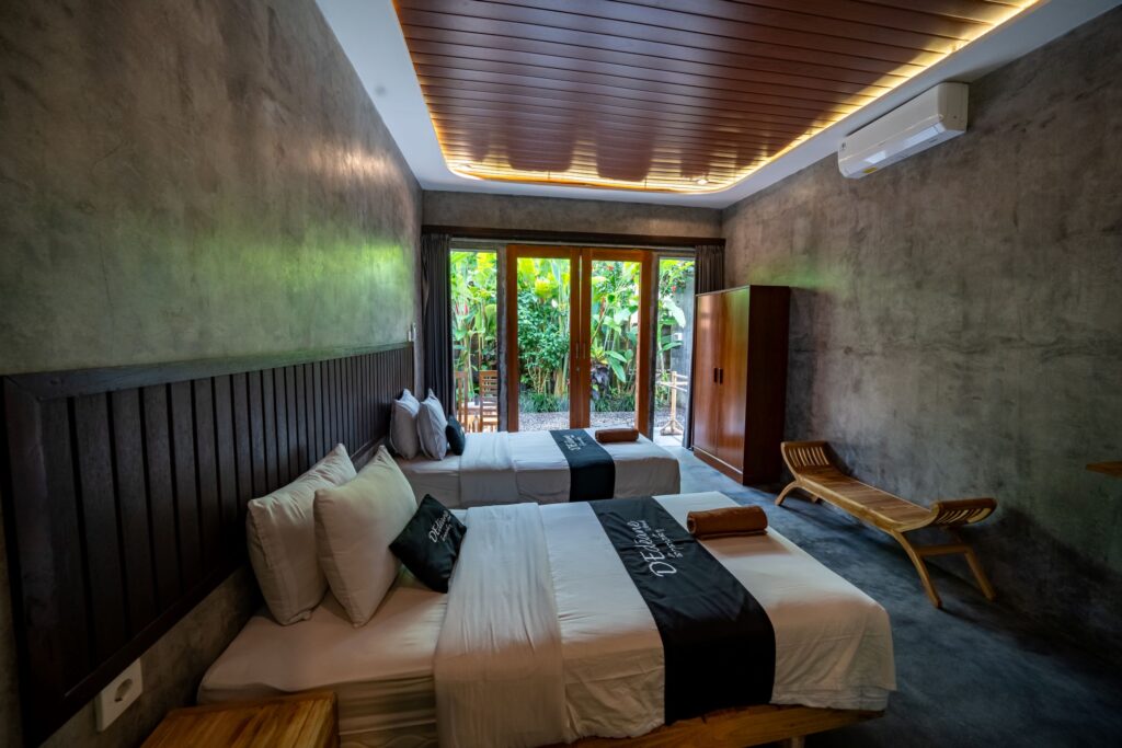 Stylish twin room with modern design, private patio, and access to a serene outdoor pool surrounded by tropical greenery.