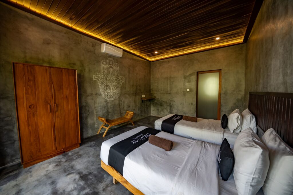 Cozy double bedroom with warm lighting, rustic concrete design, and a modern bathroom — perfect for a stylish, relaxing stay in Ubud.