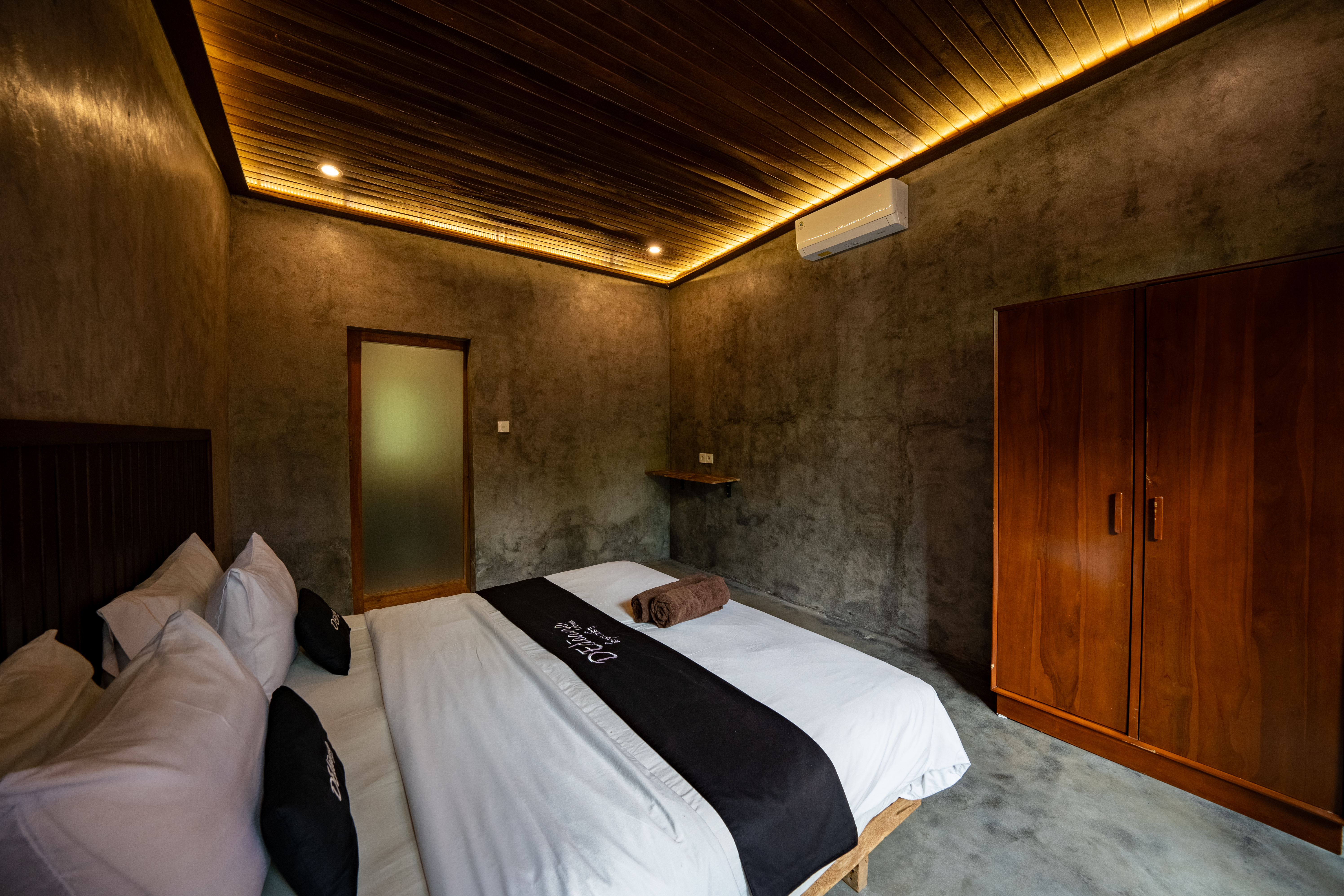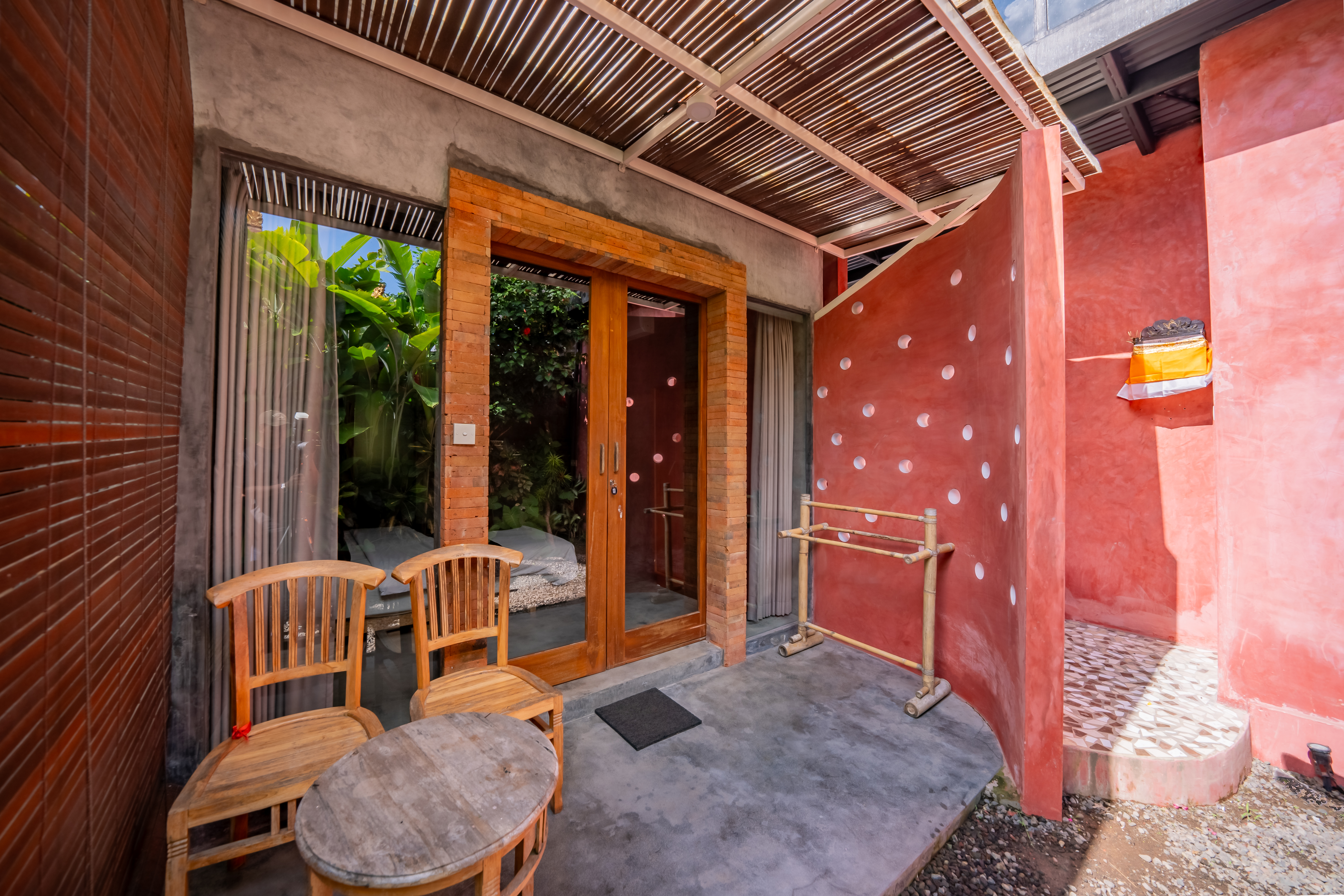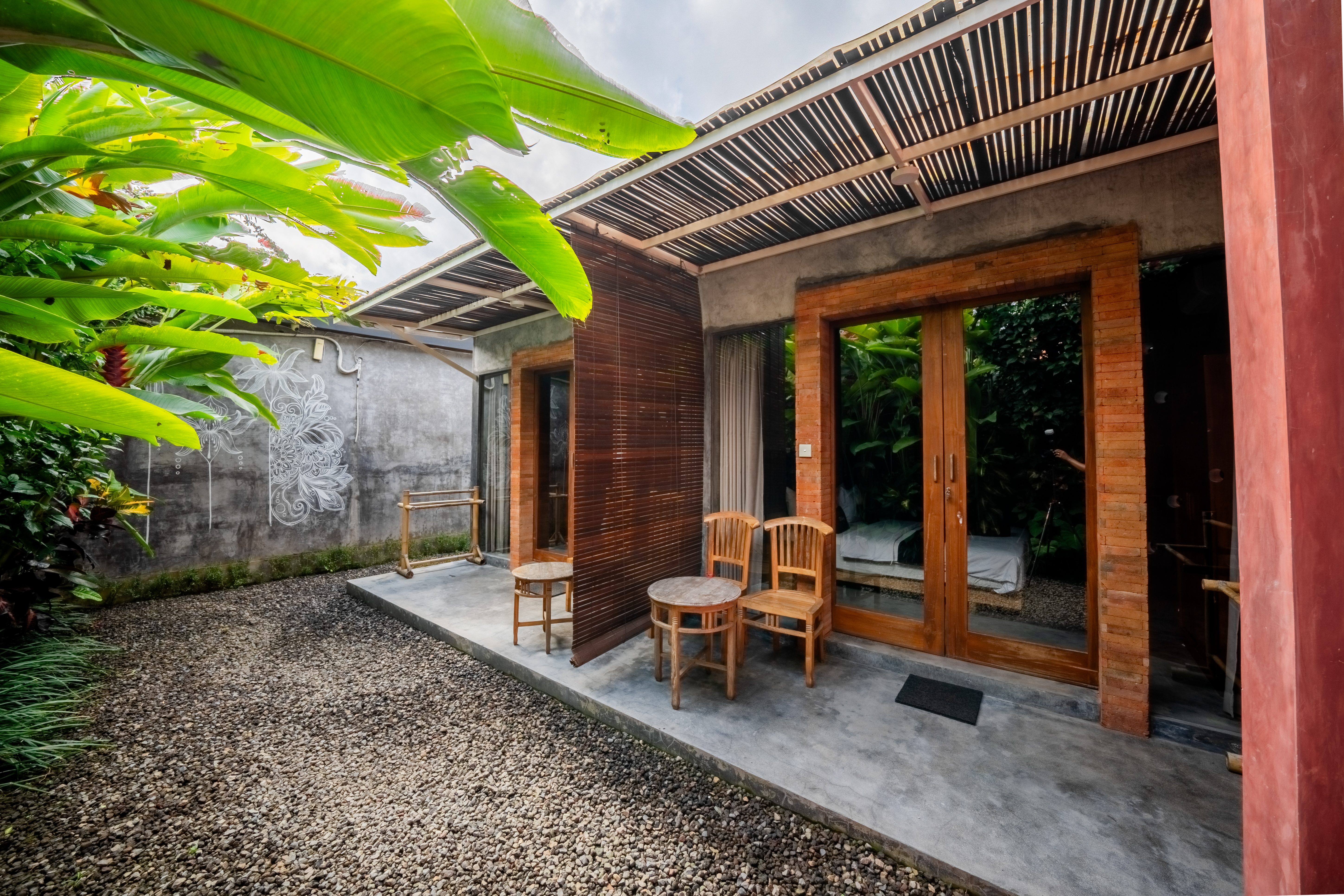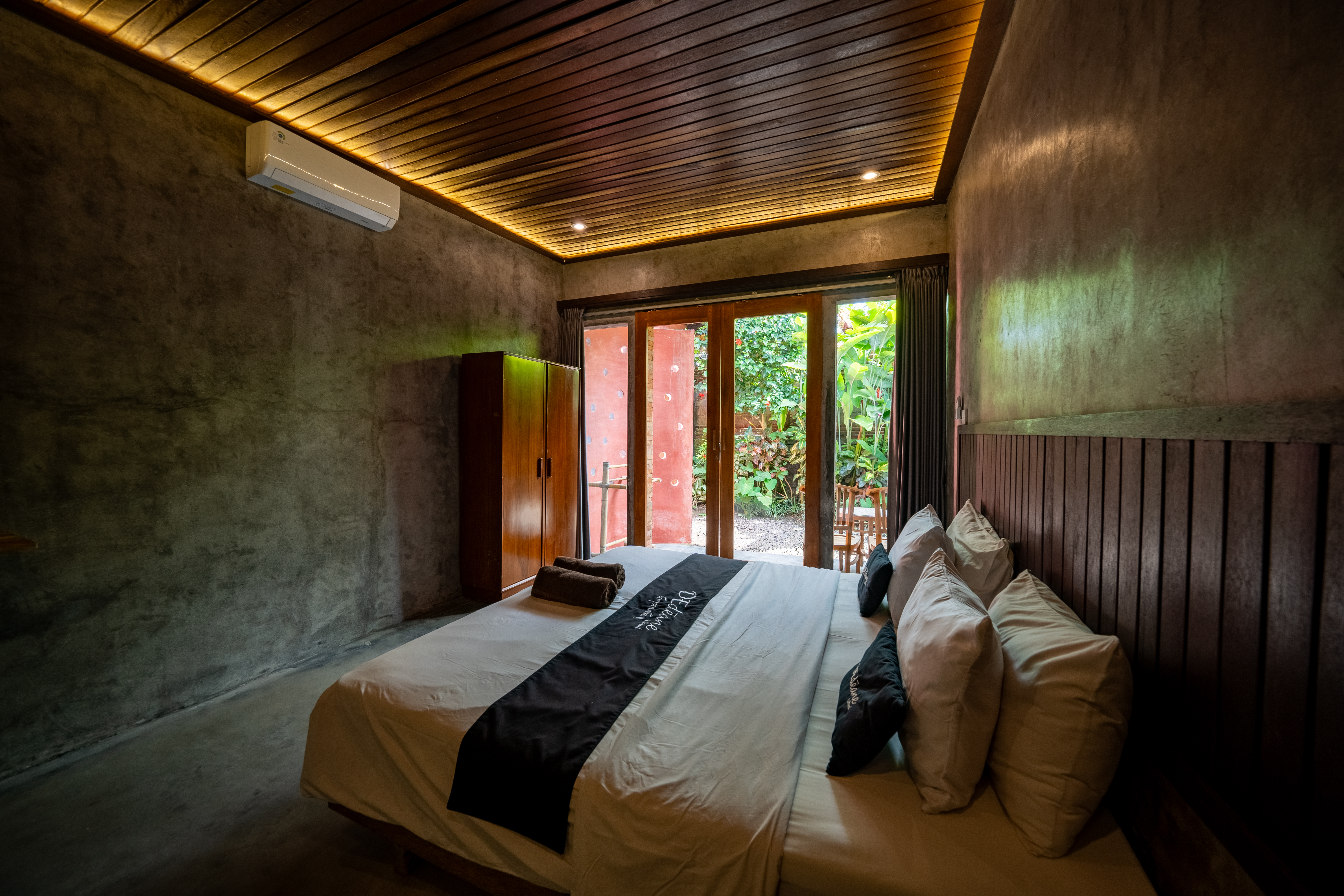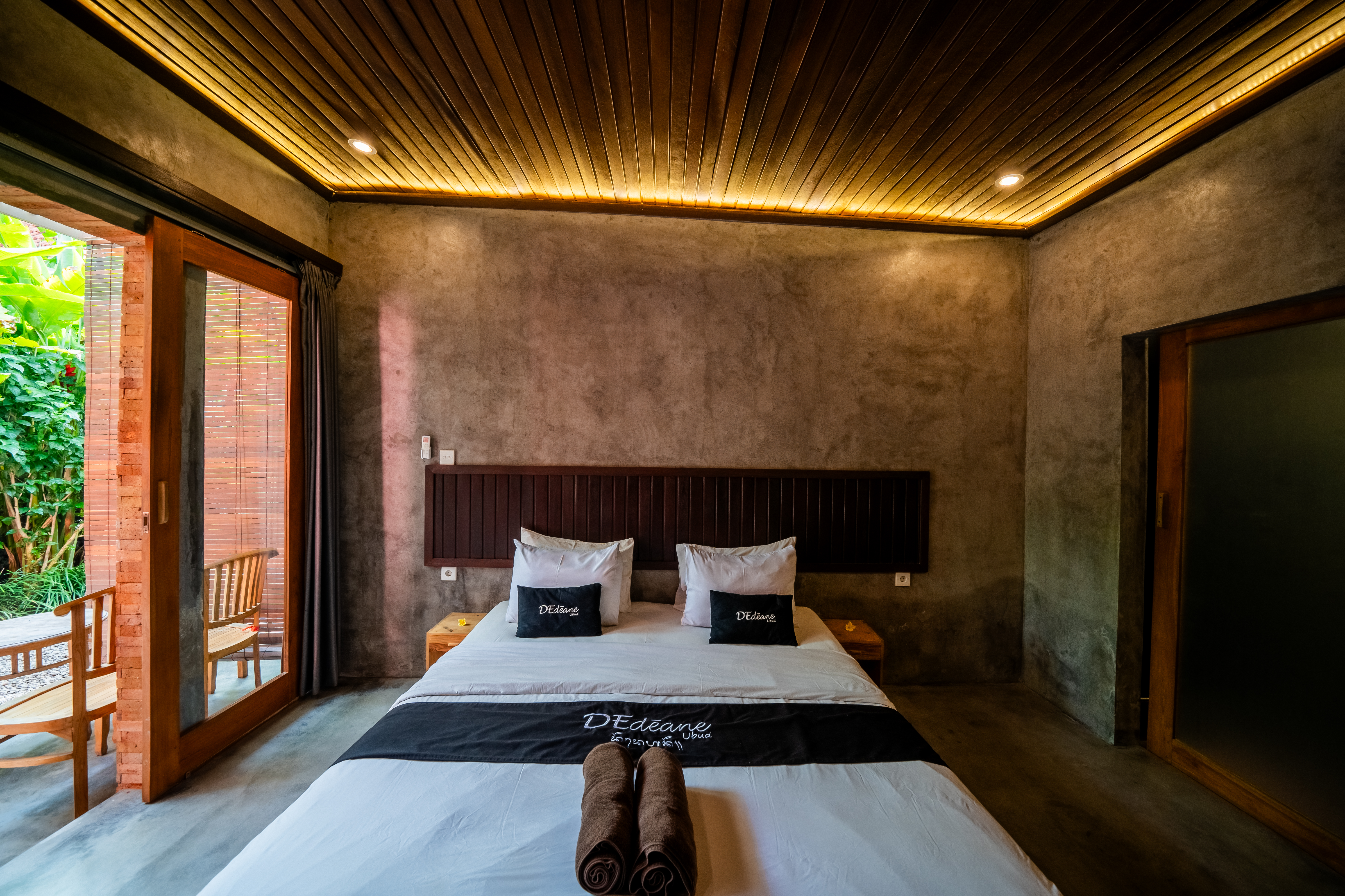 Experience the charm of a cozy retreat at D'Edeane Ubud. This room combines rustic wooden accents with modern comforts, featuring a plush double bed, stylish bathroom, and direct access to a private terrace surrounded by lush tropical greenery. Perfect for a relaxing getaway in a serene natural setting.