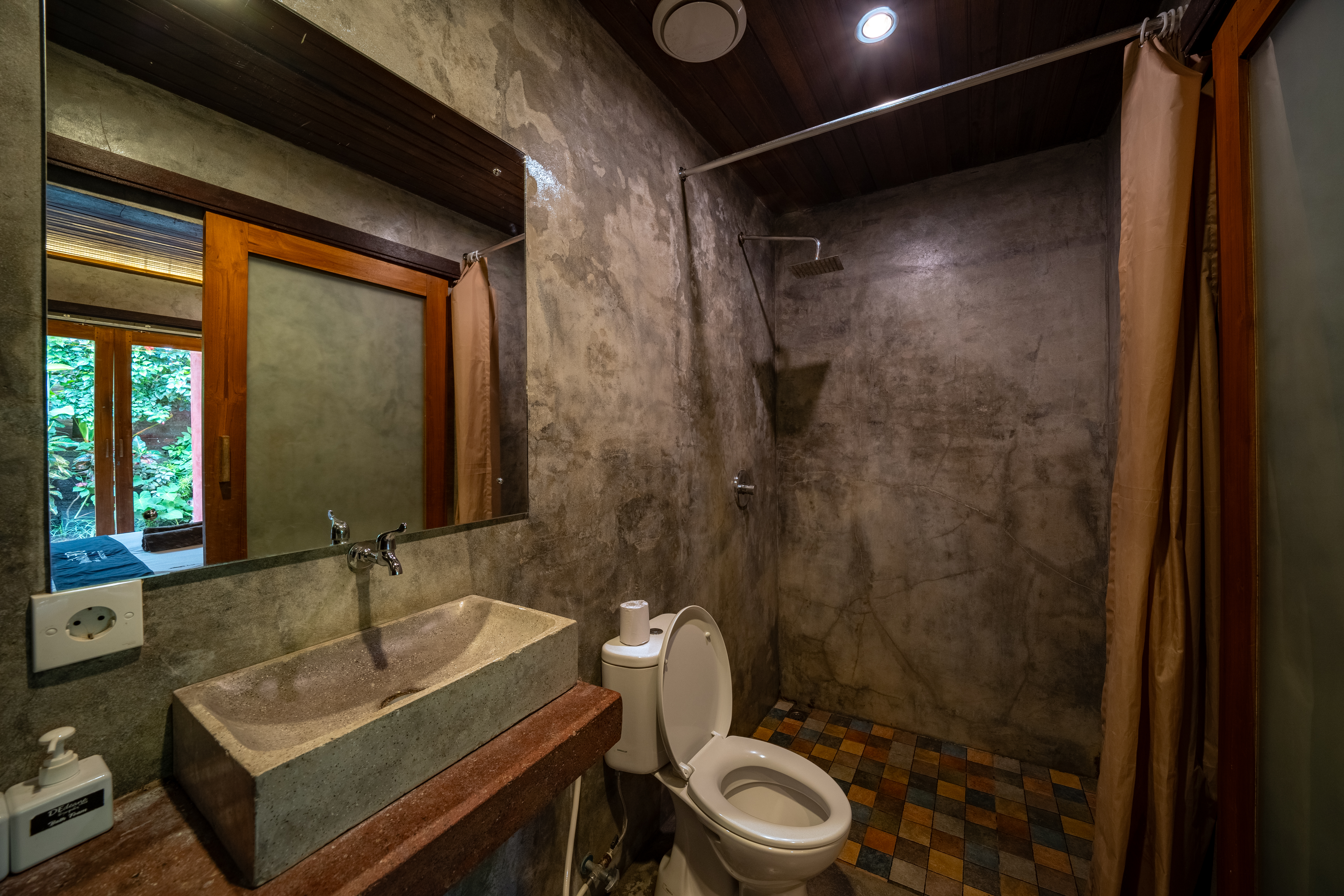 Modern bathroom with concrete sink and tropical views