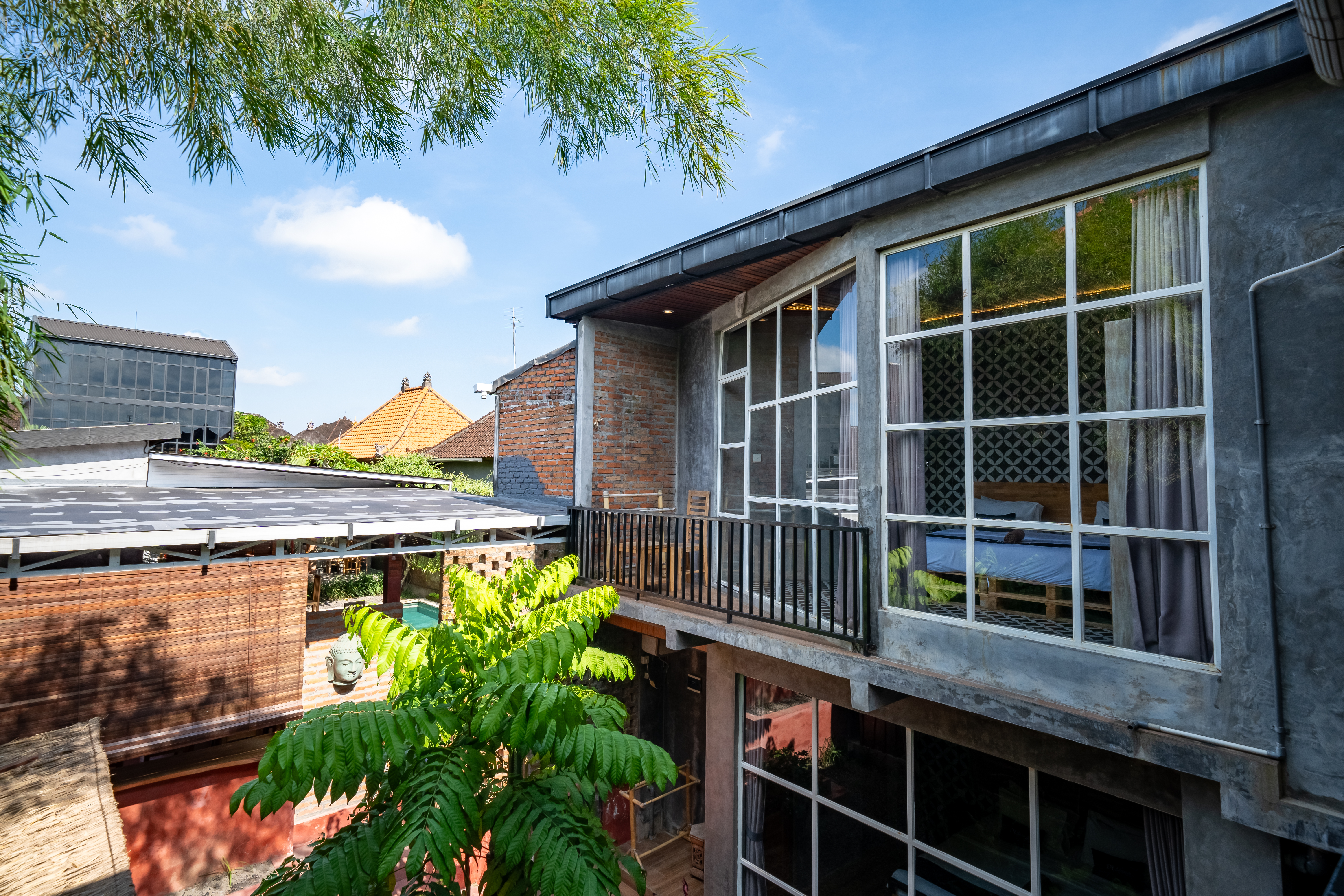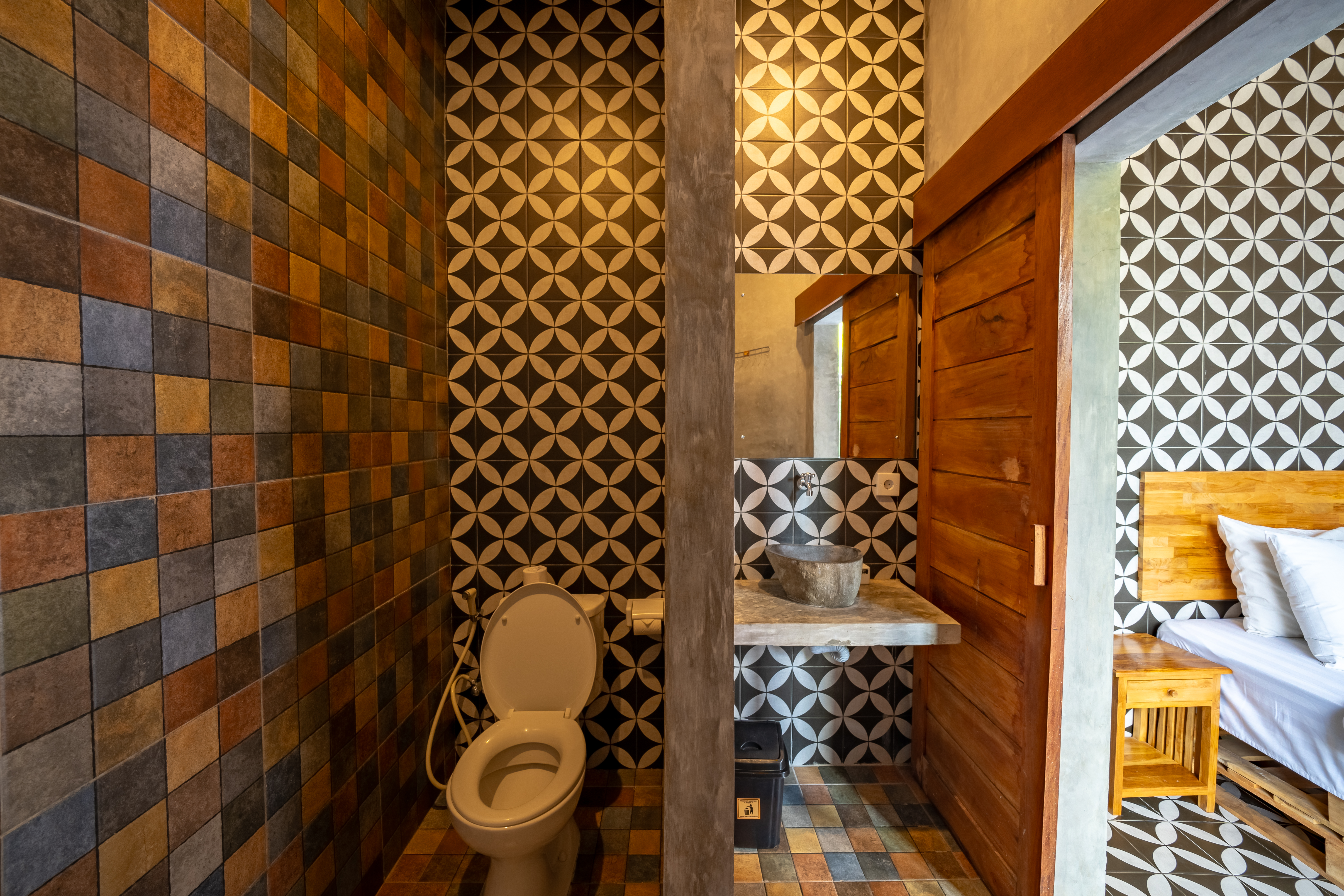 This cozy bedroom offers a serene retreat with a comfortable bed and a visually appealing patterned wall. Guests can enjoy a harmonious blend of comfort and aesthetics, ideal for rest and relaxation.